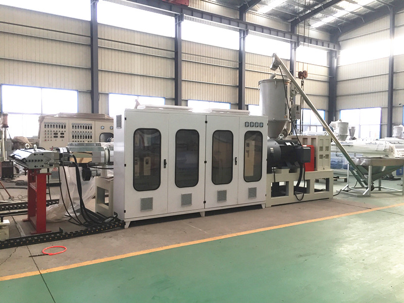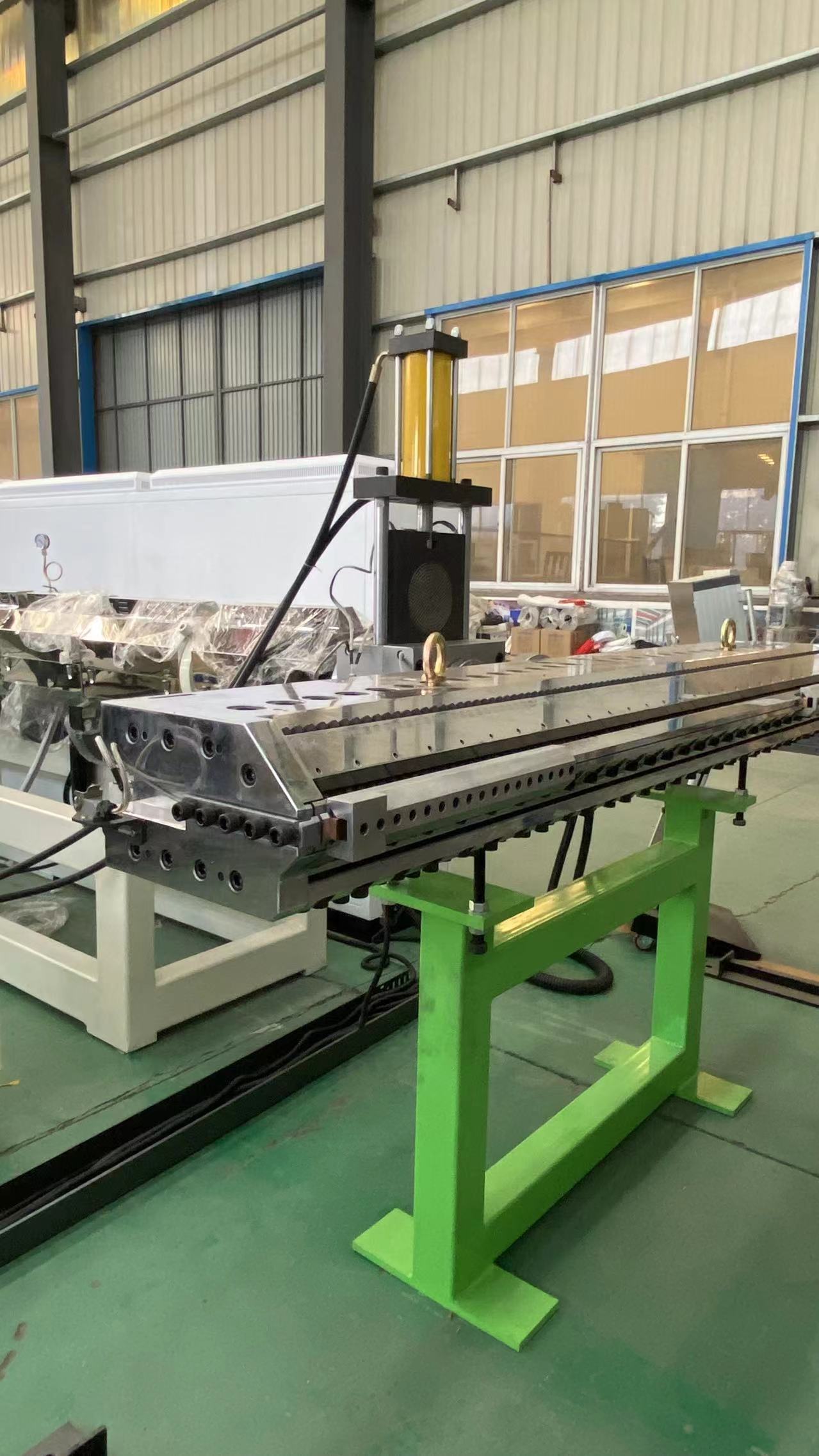 SJ150×33 enkelskruvsextrudern är kärnutrustningen i dennaPE aluminium-plast panel produktionslinje, har många tekniska fördelar. Extruderns skruv och cylinder är gjorda av 38CrMoAlA-material och genomgår en nitreringsbehandling, vilket uppnår ett nitrifikationsdjup på 0,50-0,70 mm, vilket säkerställer slitstyrka och stabilitet under långvarig höghastighetsdrift. Extrudern är utrustad med sju uppvärmningszoner och en värmeeffekt på 42 kW, vilket uppnår en maximal extruderingseffekt på 800 kg/timme, vilket tillgodoser behoven för högeffektiv produktion. Huvudmotorn använder en 160 kW Siemens AC-motor, i kombination med en spiralformad växelreducerare, vilket möjliggör steglös hastighetsreglering från 0 till 70 rpm.