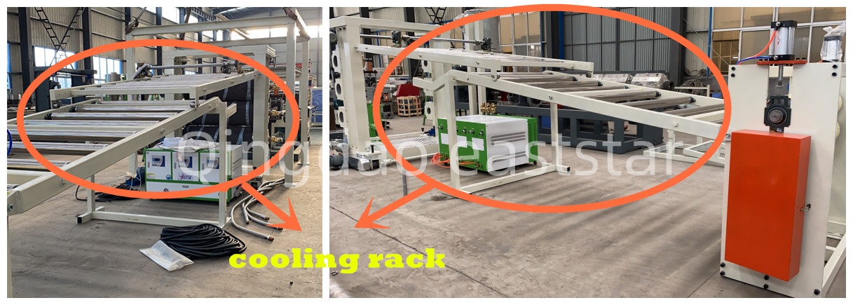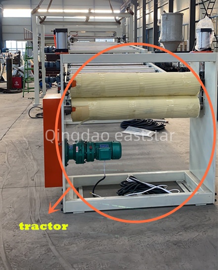 Helaflerskikts samextruderingslinjeinkluderar även två hydrauliska skärmväxlare, ett 8-meters kylstöd och ett dragklippsystem. Skärmväxlaren använder taiwanesiska hydrauliska komponenter, vilket möjliggör skärmbyten utan att stoppa maskinen. Dragmaskinen är utrustad med Φ240×2500 mm nitrilgummirullar, drivna av en 2,2KW motor, vilket uppnår synkron hastighetsreglering med de tre rullarna. Det elektriska styrsystemet för ABS co-extruderingsplåtsutrustning använder en Siemens S7 serie PLC och pekskärm, kombinerat med en ABB frekvensomvandlare, för att säkerställa koordinerad drift av hela linjen.