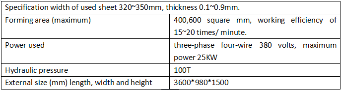 Teknisk parameter för såddmaskin för plantskolabrickor Specifikationsbredd på använda ark: 300~320mm, tjocklek: 0,8~2mm. Formningsyta (max): 400*600 mm, arbetseffektivitet 15~20 gånger/minut. Effekt som används: trefas fyrtråd 380 volt, maximal effekt 25KW Hydraultryck: 100T Yttre storlek (mm) längd, bredd och höjd) 3600mm*980mm*1500mm