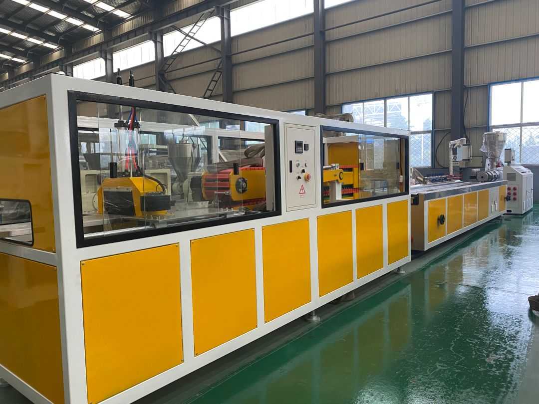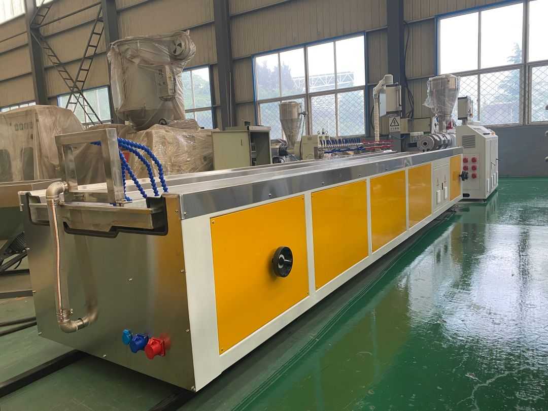 Produktionslinje för strängsprutning av PVC-golv - Träplastgolvsträngsprutningslinjen använder SJZ65/132 konisk dubbelskruvsträngsprutmaskin, som är speciellt använd för strängsprutning, mjukning och formning av PE-pulver + träpulverråmaterial. Den har egenskaperna hög effekt, god mjukgörande effekt och låg energiförbrukning.